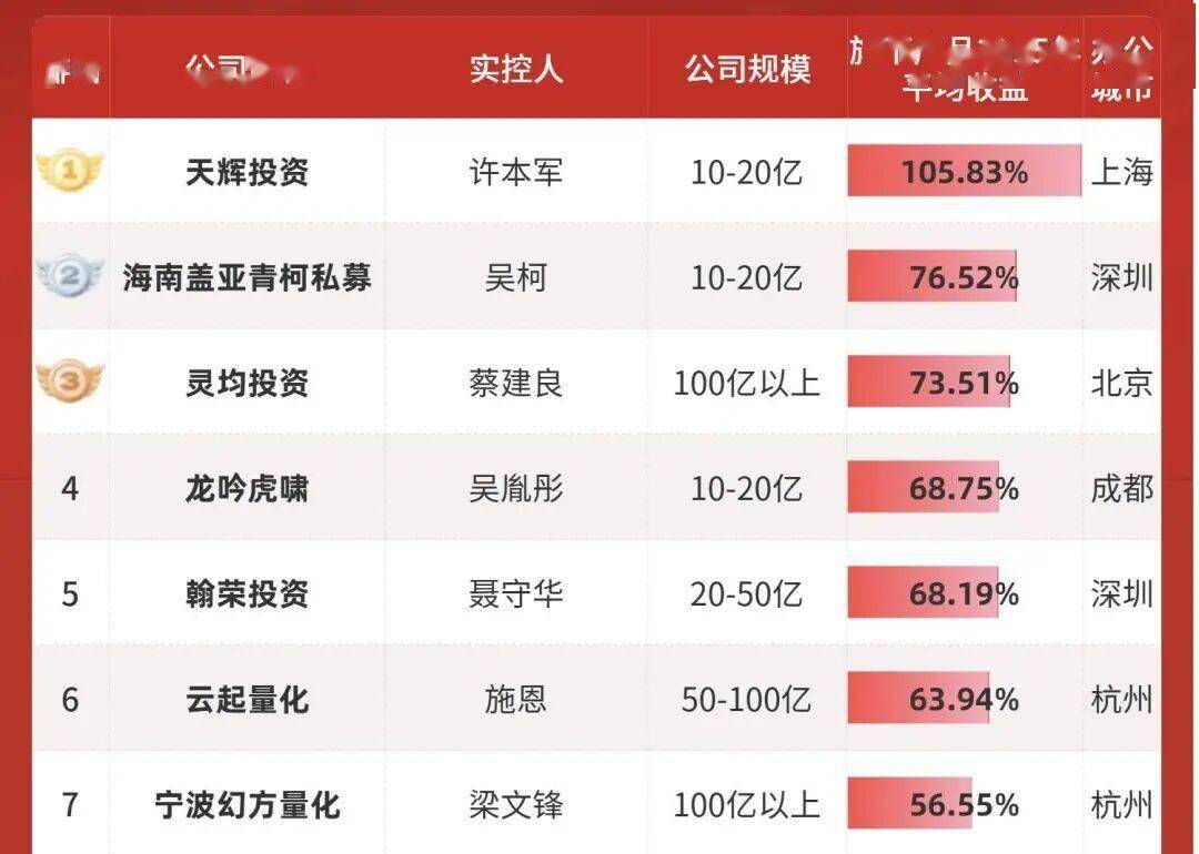 年度私募百强榜,按照公司平均收益排名,幻方量化位于第七名,百亿以上规模排名第二|