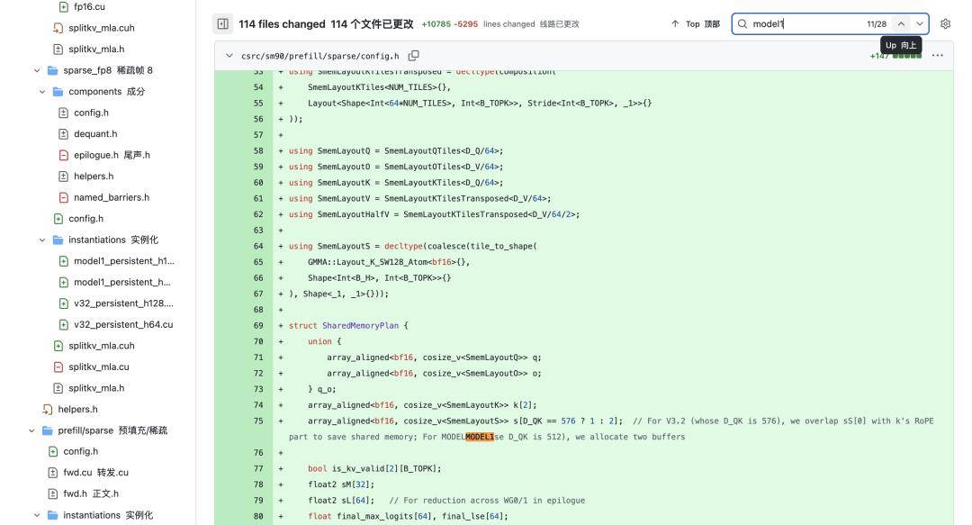 在代码逻辑结构中,「MODEL1」是作为与「V32」(即 DeepSeek-V3.2)并列的独立分支出现的,这一细节意味着「MODEL1」并不共享 V3 系列的参数配置或基础架构,而是一个全新的、独立的技术路径。