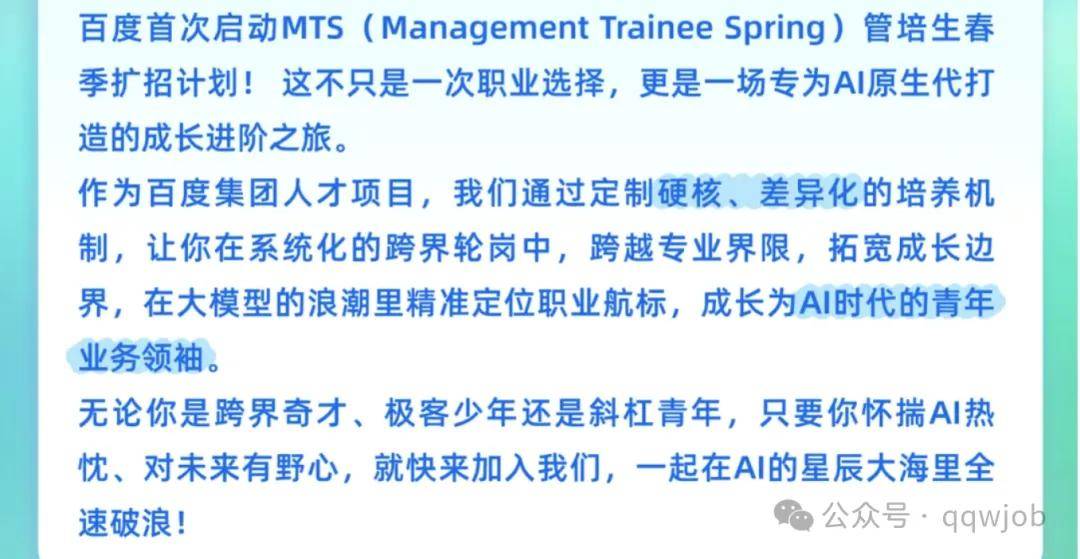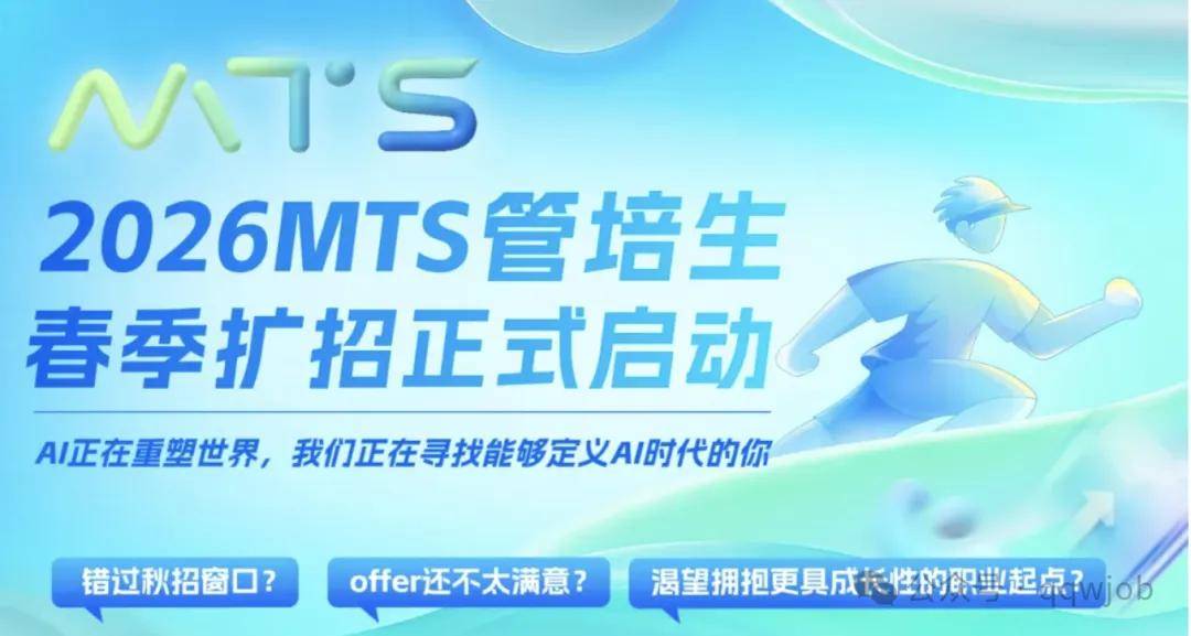 而此次推出的2026MTS管培生春招,将深入人工智能核心业务场景,在产品、运营、研发、战略、商分、人力资源等岗位轮岗。